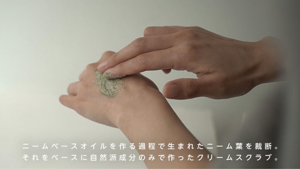一つ目のニームリーフベースオイルで使用したニーム葉を、廃棄することなく再利用したクリームスクラブ。